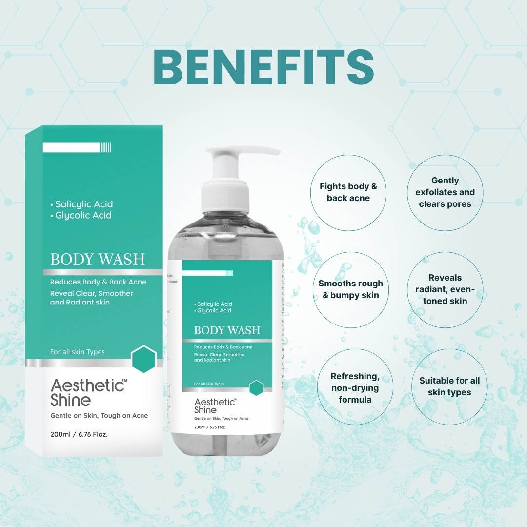 Say goodbye to body and back acne with Aesthetic Shine Acne Body Wash, a dermatologist-inspired formula designed to deeply cleanse pores, control excess oil, and gently exfoliate without irritating the skin. Ideal for daily use, it helps reveal smoother, clearer, and healthier-looking skin from head to toe.
