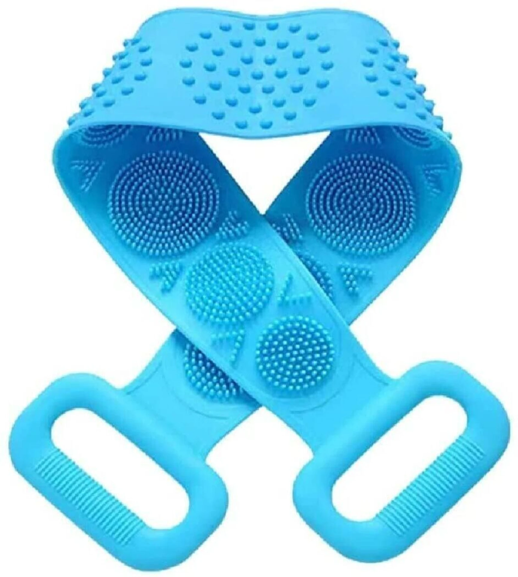 Double-Sided Design: One side with firm silicone bristles/textures for exfoliating dead skin and stimulating circulation; the other side smoother for gentle massage and cleansing., Long Strap / Belt Style for Back: Designed to reach your back and shoulders easily, making it ideal for full-body cleansing rather than just front surfaces.